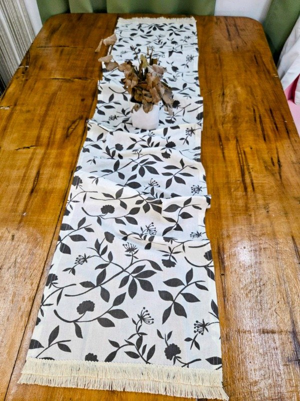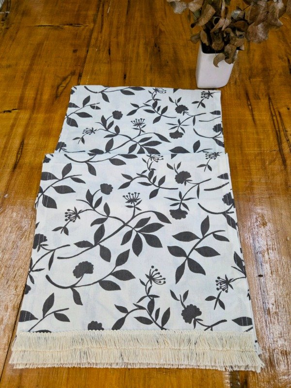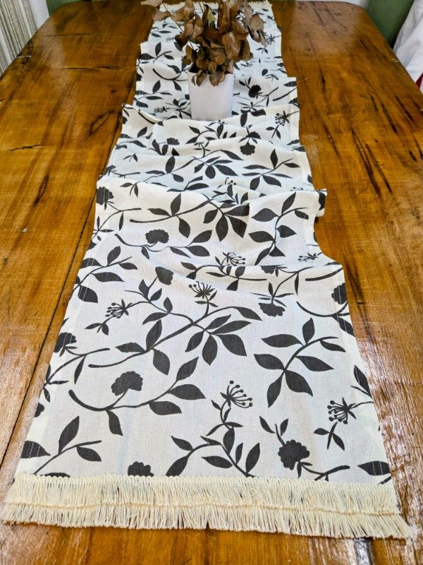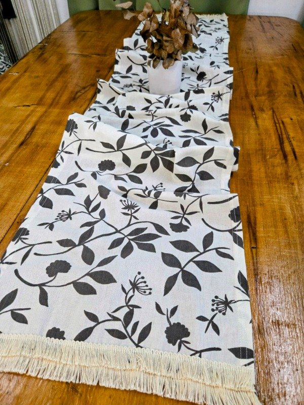 Camino de mesa estampado de tusor con hojitas negras, detalles de algodón crudo. Medidas 35 x 1.70.