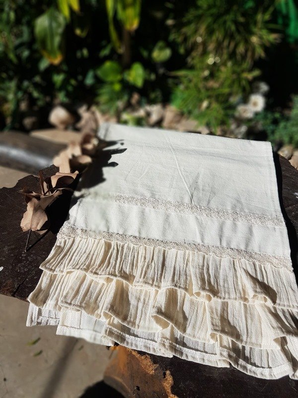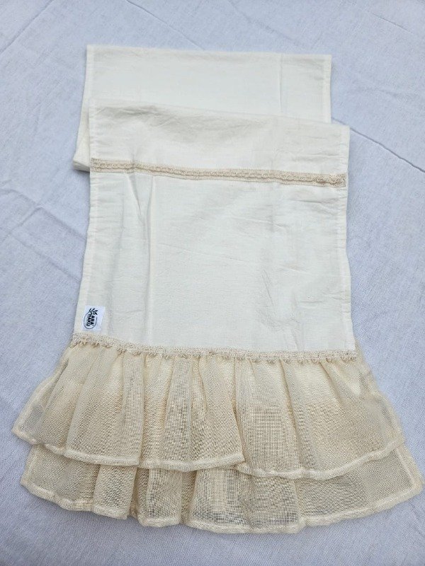 Camino de tusor natural con volados de gasa y detalles de algodón beige. Medidas 35 x 1.60.