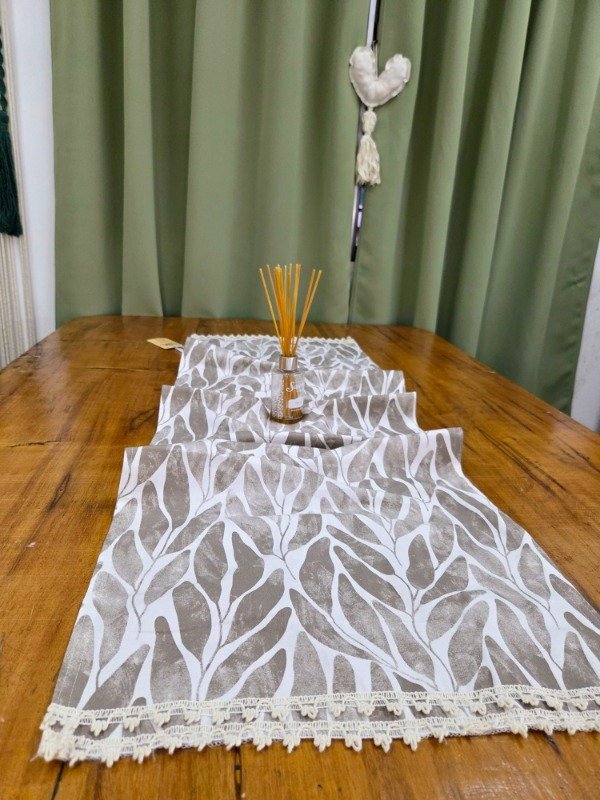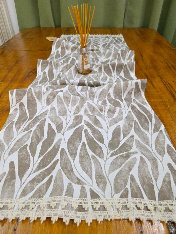 Camino de gabardina estampada hojas beige. Medidas 35 x 1.60. Detalles de algodón crudo.