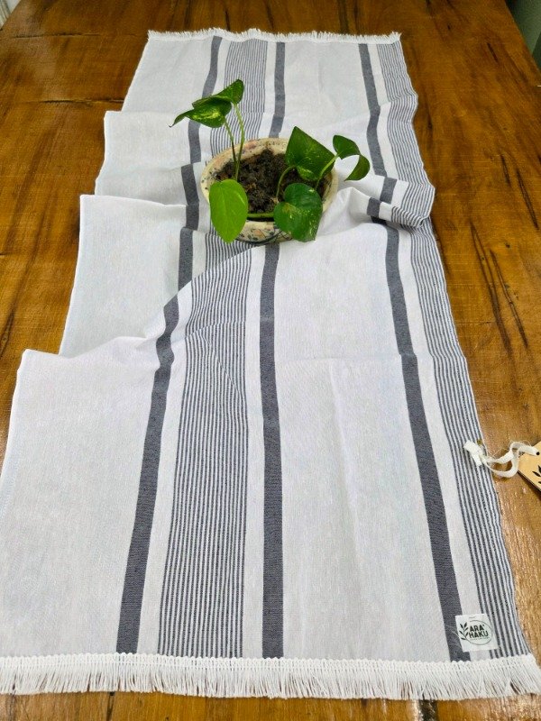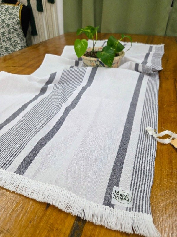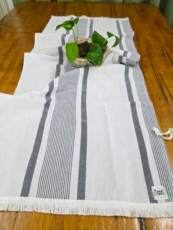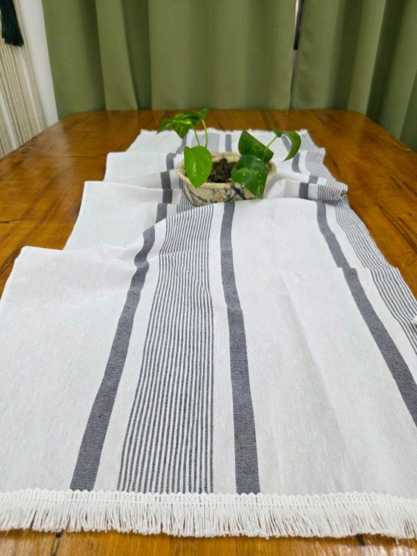 Camino de tusor rustico de fondo blanco y rayas azul. Medidas 45 x 1.10. Detalles de algodón blanco.