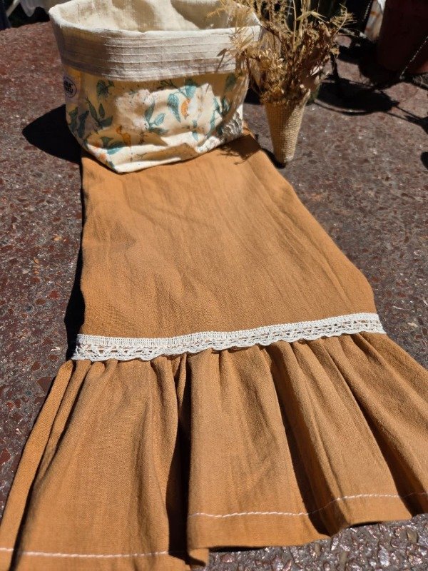 Canasta combinada estampado/natural. Camino tusor ocre con detalles de algodón crudo. Medidas 35 x 1.60 aprox.