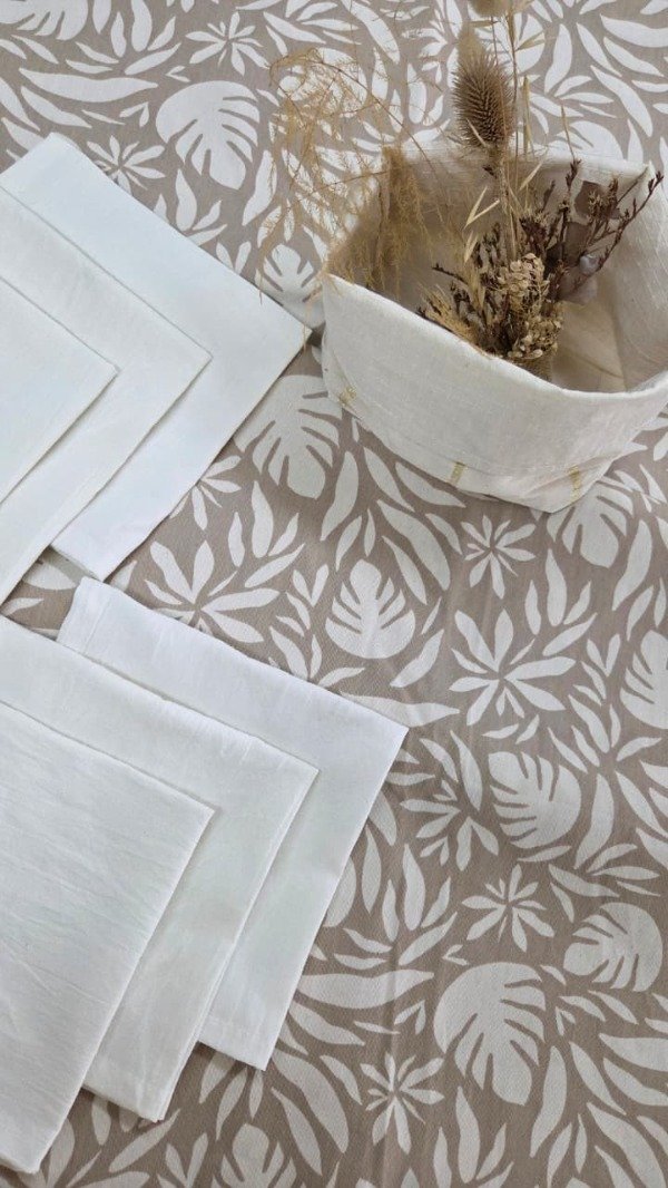 Combo beige, ideal para una mesa perfecta! Mantel de gabardina estampado de hojas crudo fondo beige de 2m, 6 servilletas de tusor crudo mas canasta combinada de arpillera rustica.