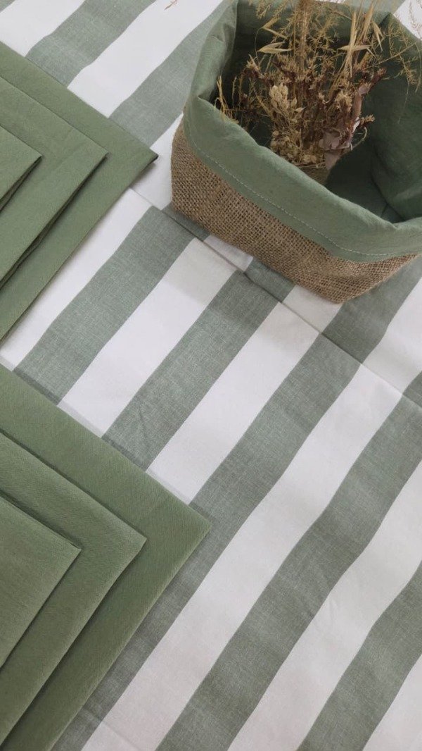 Combo ideal para una mesa perfecta, mantel de tusor estampado efecto lino rayas verde de 2m, 6 servilletas de tusor verde 40 x 40 más canasta combinada con arpillera rústica.