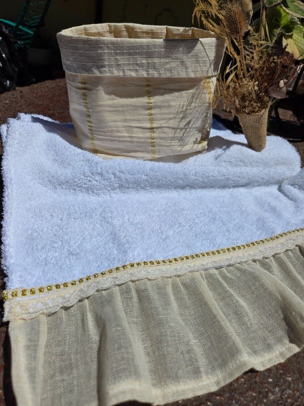 Canasta con rayas lurex dorado mas camino de tusor natural con volado de gasa y detalles de algodón crudo. Medidas 1.60 aprox de largo ancho 0,40.