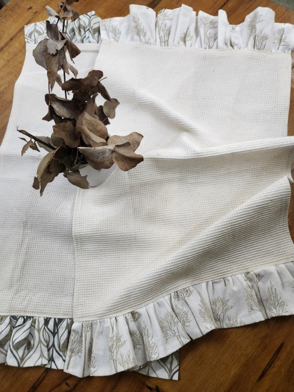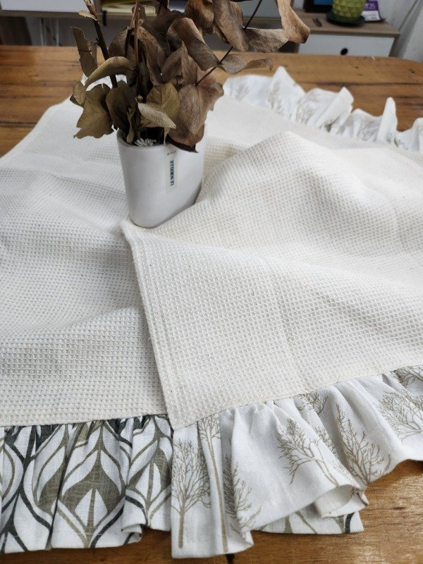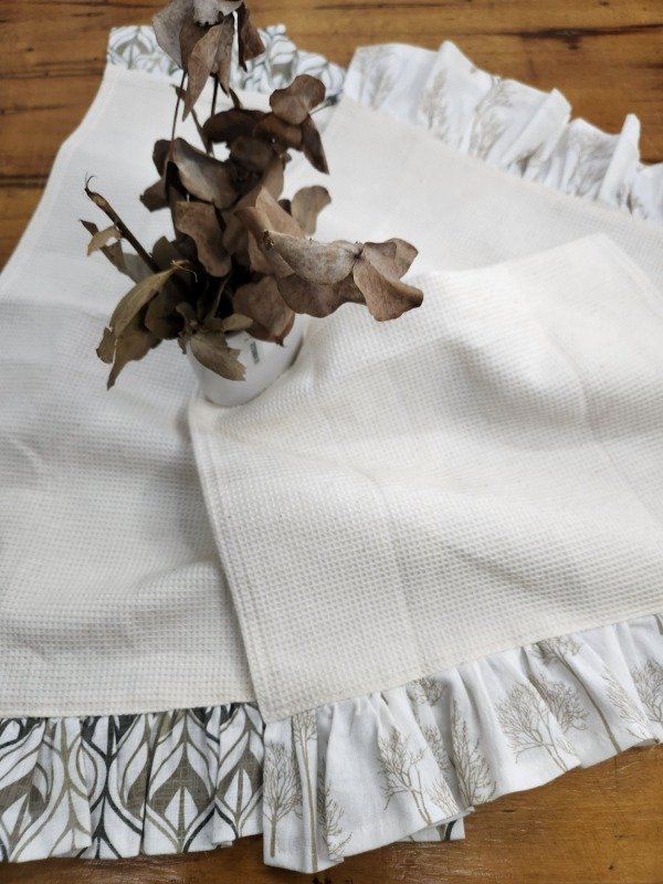 Dos repasadores de nido de abeja crudo con volados en tusor. Medidas 70 x 40 aprox.