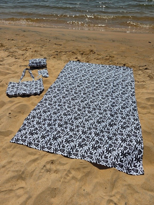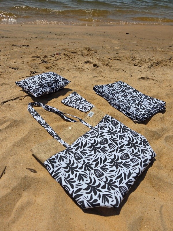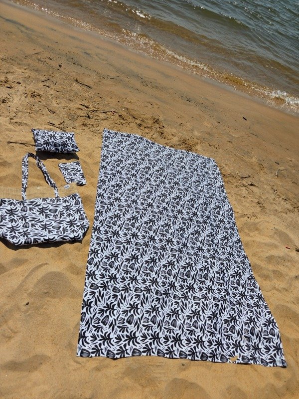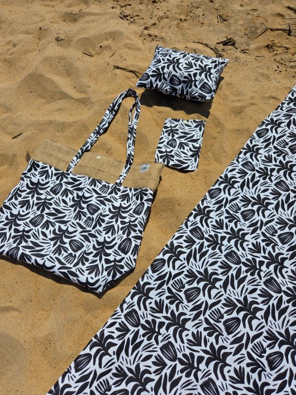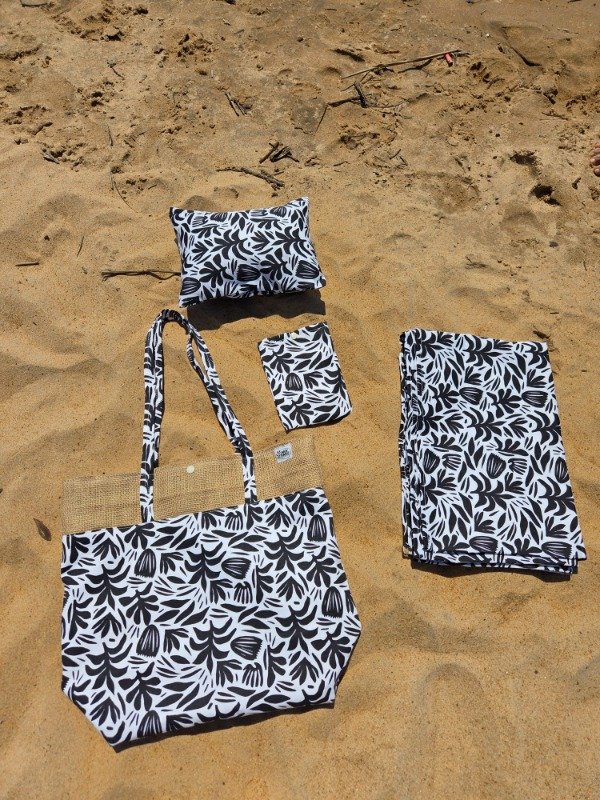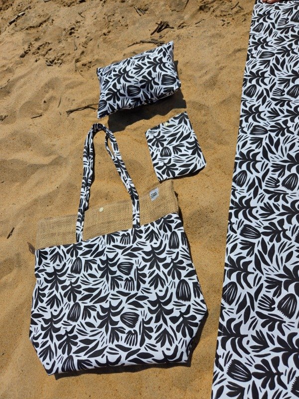 Set de playa/picnic. Bolso forrado con tela impermeable, combinado gabardina estampada con arpillera rústica. Medidas 40 x 38 aprox. Almohadita con funda. Manta 1 x 1.60 mas estuche forrado. ♡