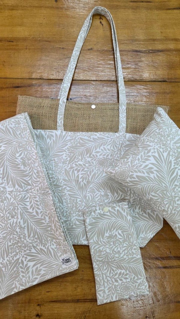 Set de playa/picnic, incluye bolso forrado con tela impermeable, combinado con arpillera rustica, medidas38 x 40 aprox. Manta de gabardina estampada, medidas 1 x 1.60. Almohadita con funda más estuche forrado con tela impermeable de regalo.