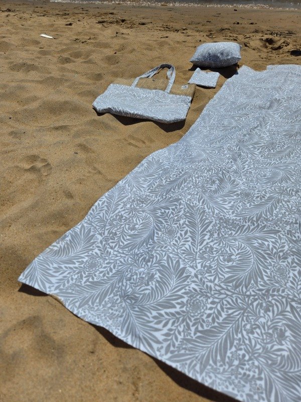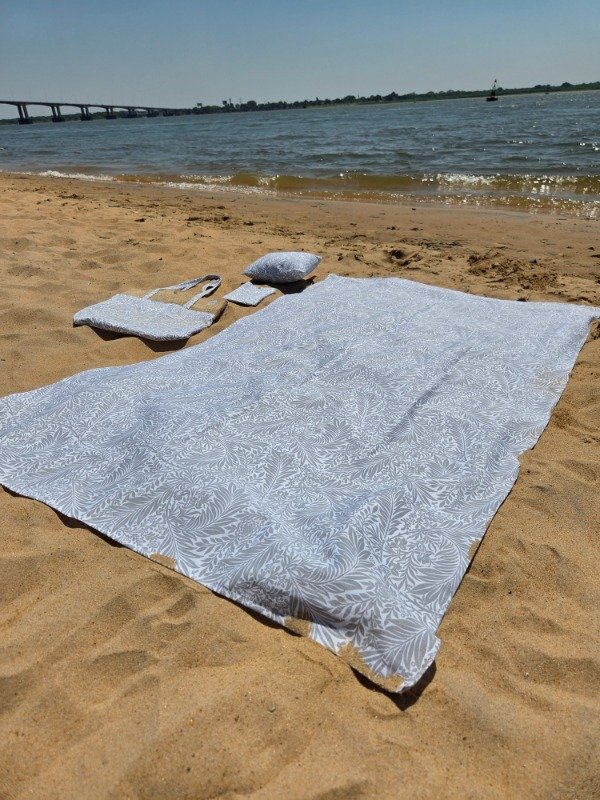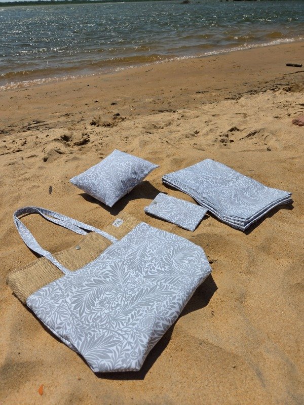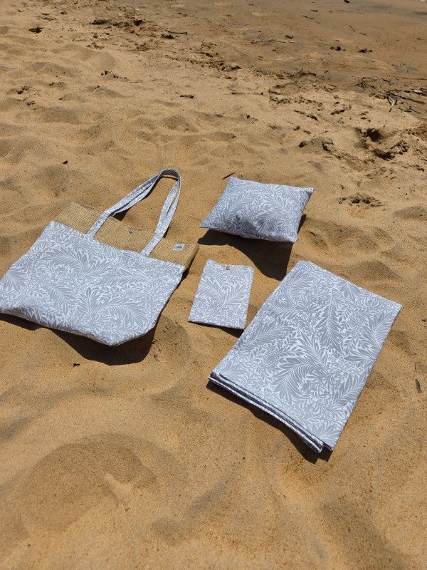 Set de playa/picni. Bolso forrado con tela impermeable, gabardina estampada combinado con arpillera rustico. Medidas 40 x 38 aprox. Manta 1 x 1.60. Almohadita con funda y estuche forrado. ♡