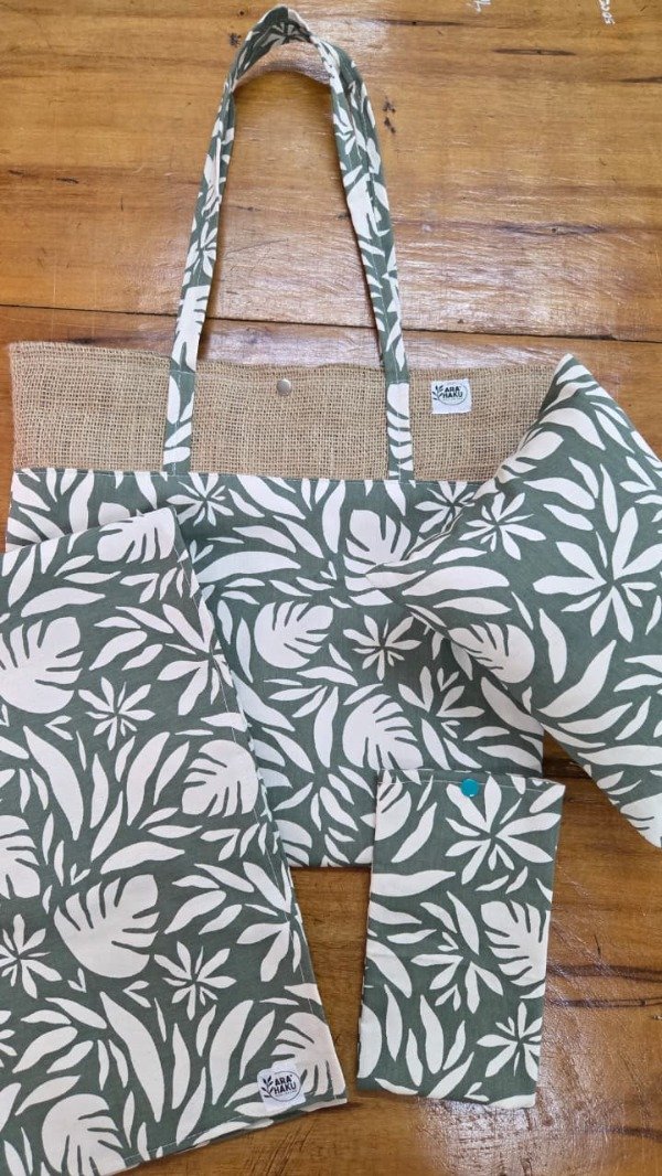 Set malva, incluye bolso forrado con tela impermeable combinado con arpillera rustica, medidas 38 x 40 aprox. Manta de gabardina estampada, medidas 1 x 1.60. Almohadita con funda más estuche forrado de regalo.